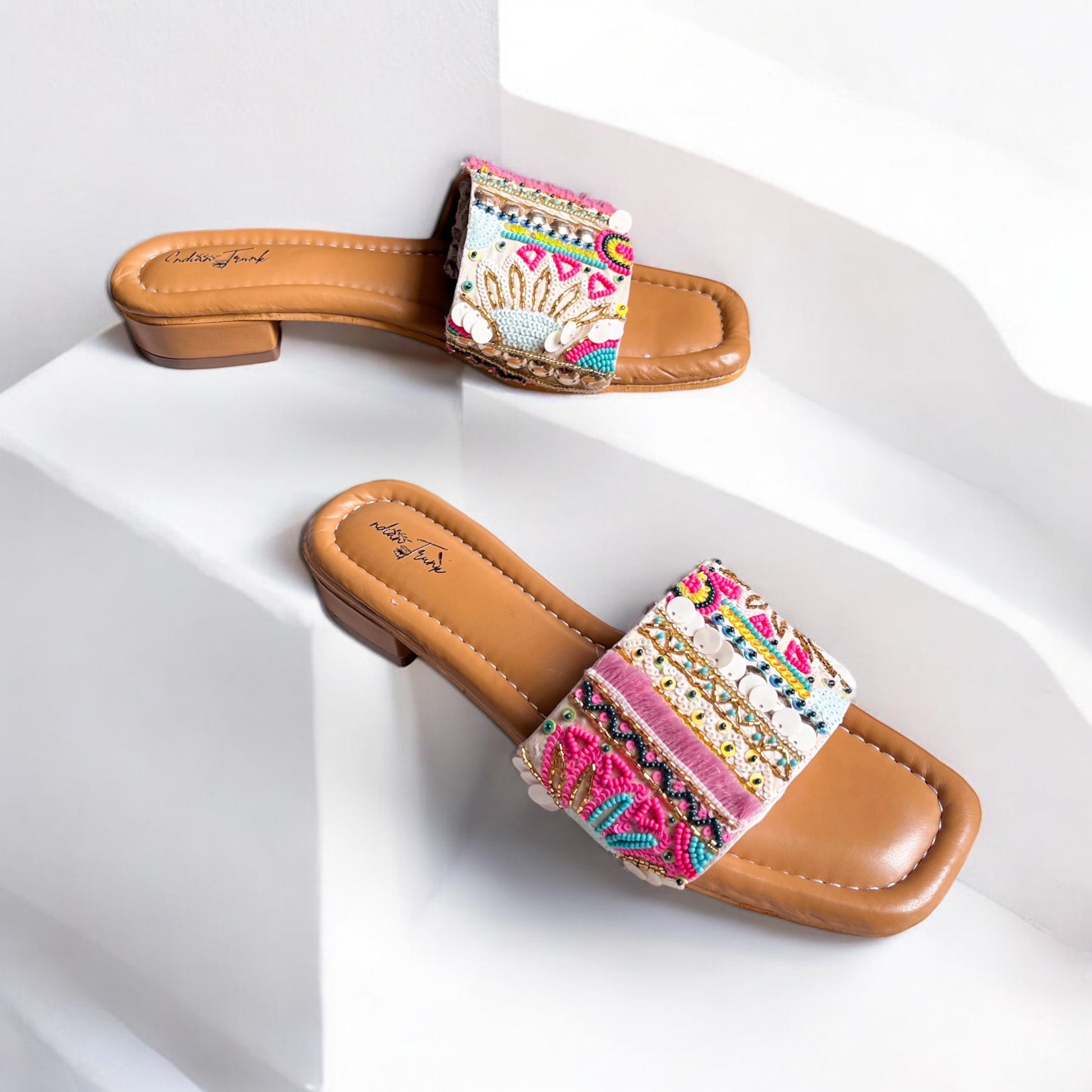 A celebration in every step. Desi Pop Sliders bring together vibrant embroidery, sequins, mirrors, and beads in a riot of colors, set on a comfortable block heel base. Easy to slip on yet impossible to miss, they’re perfect for festivals, sangeets, or just adding a pop of color to your everyday looks. These multicolor embroidered sliders for women are the kind of pair that make every outfit feel like a party.