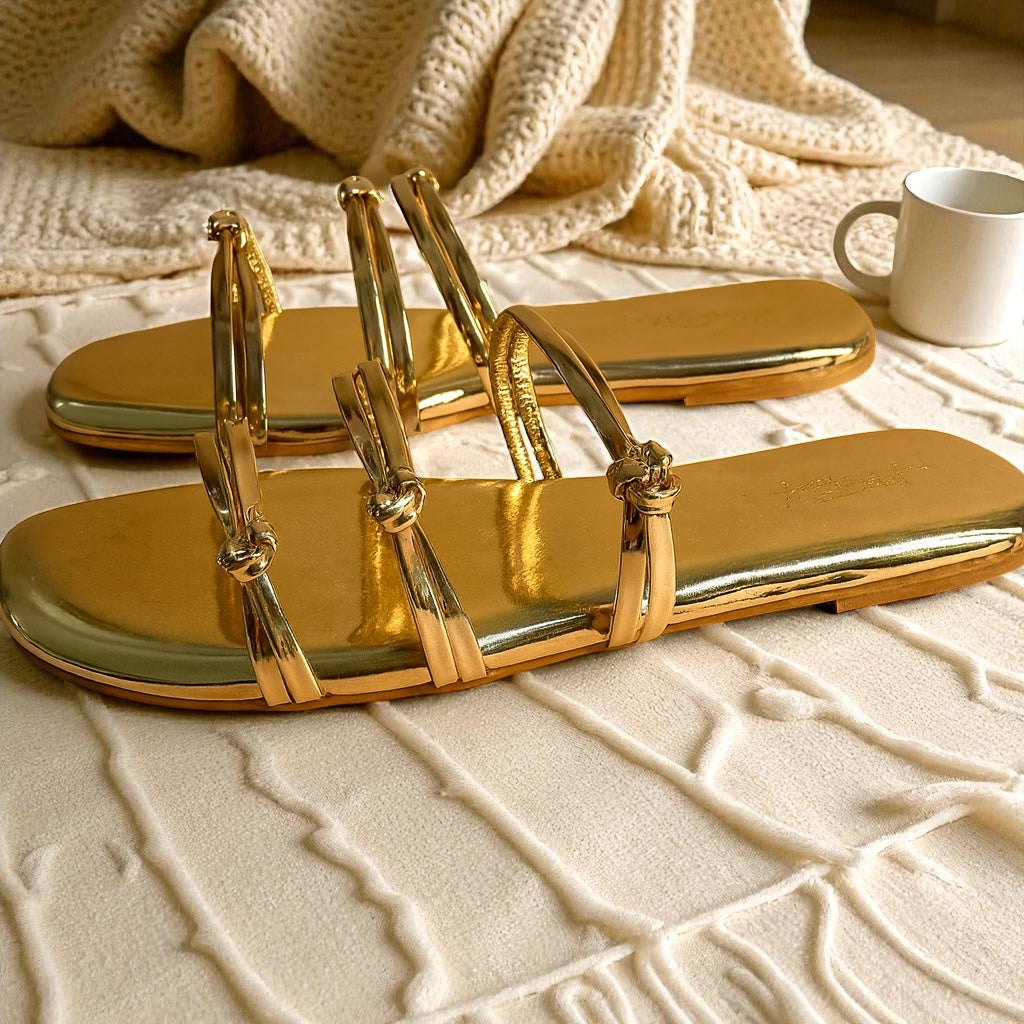 A shimmer that never tries too hard. Golden Gloss & Glow Flats feature sleek metallic straps with a lustrous gold finish that catches the light effortlessly. Designed to transition from festive evenings to chic everyday looks, these flats blend minimal design with maximum impact. Comfortable, versatile, and timeless — they’re the golden touch every outfit needs.