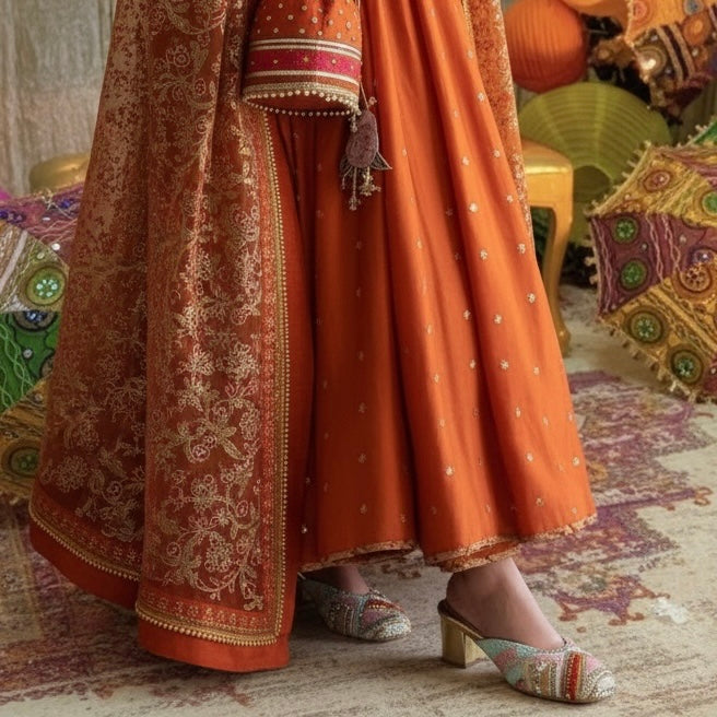 Designed to stand out in festive settings, the Orange Fringe Multicolour Jutti Heel features heavy hand embroidery with beads, sequins and zari detailing, finished with a distinctive orange fringe accent that adds movement and character. The vibrant multicolour surface makes it a statement pair, while the jutti-style front and comfortable heel ensure ease of wear through long celebrations.