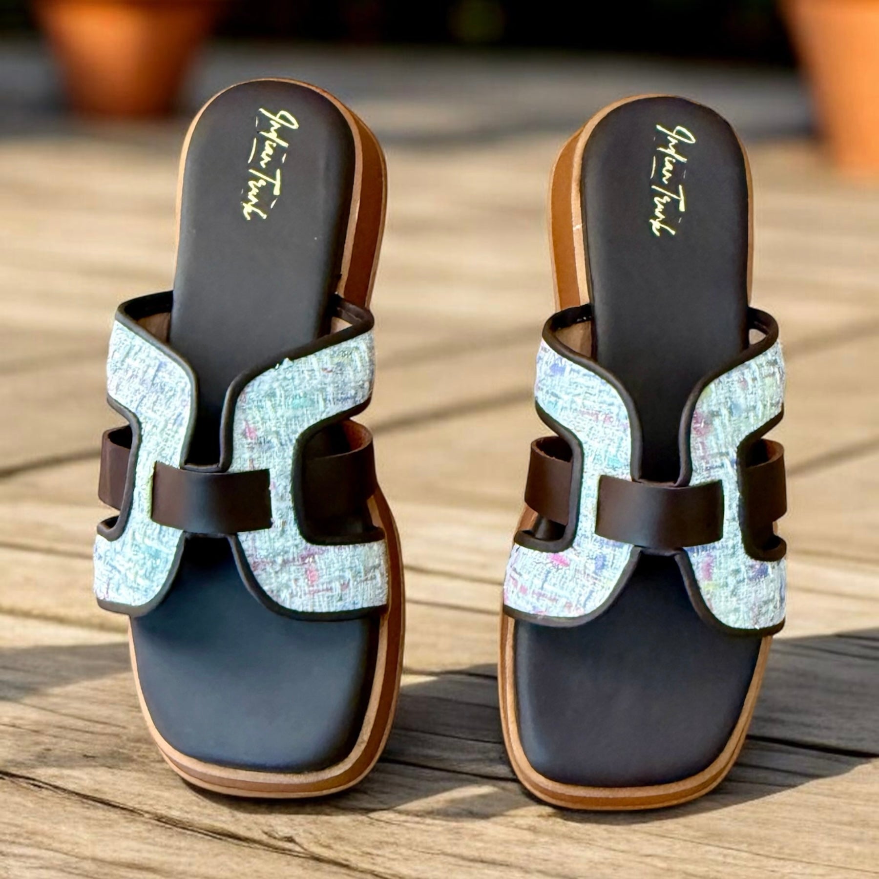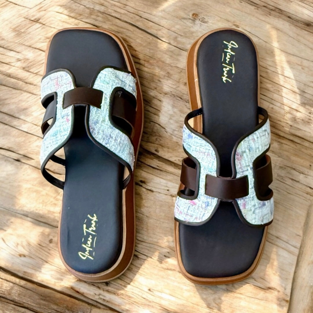 H-Strap with Tweed Accent Platform Wedges- Coffee Brown