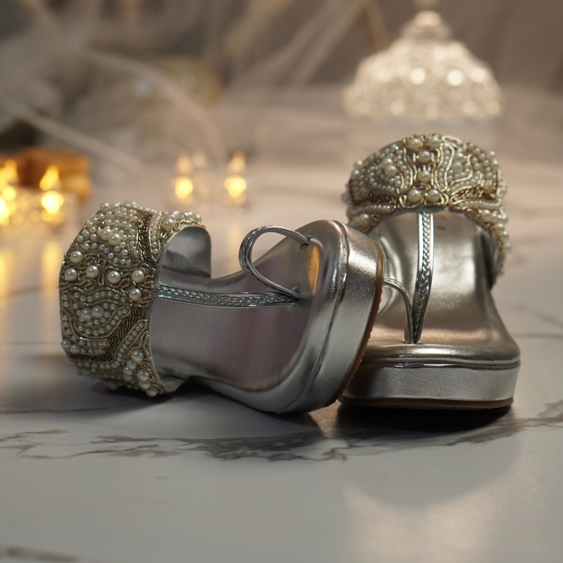 There’s something captivating about the quiet shimmer of silver. Soft, balanced, and endlessly versatile. The Silver Haze Kolha Wedge brings that elegance to life, blending a sleek silver base with a golden hand-embroidered strap adorned in delicate pearls.